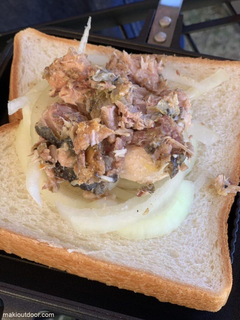 朝は鯖缶でさばサンド。もう一個のはなんだったっけ・・?