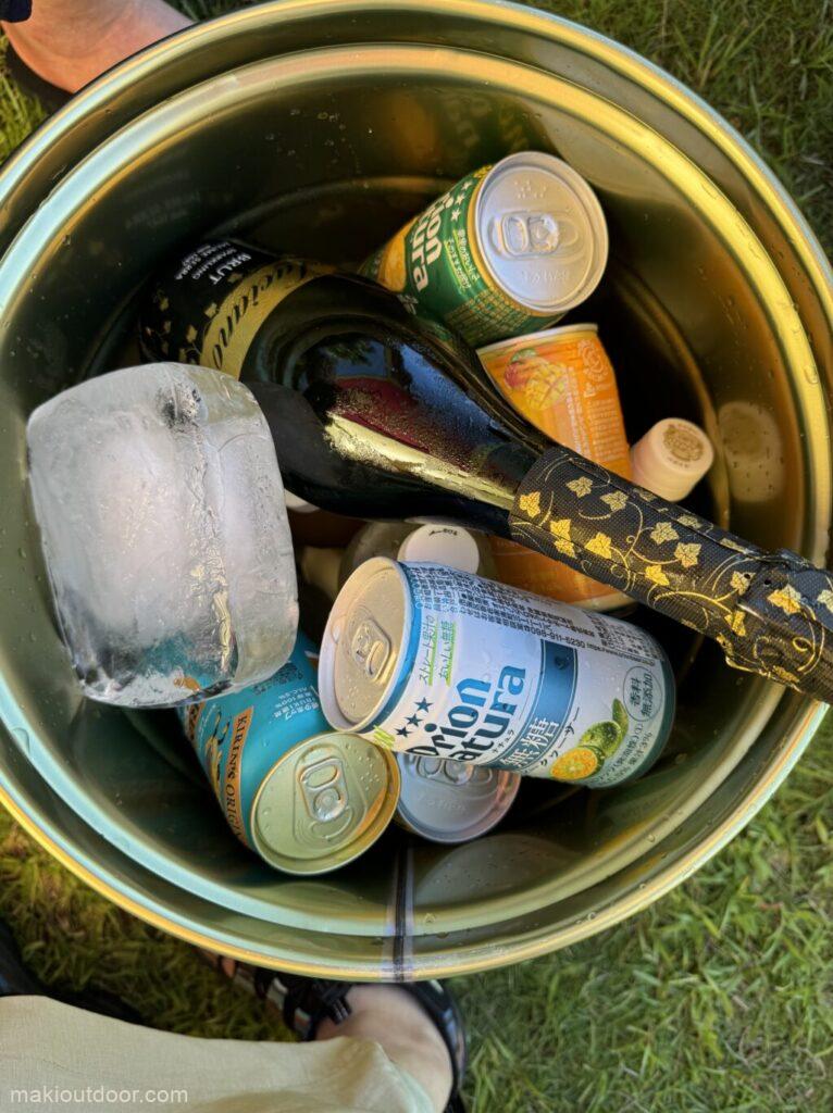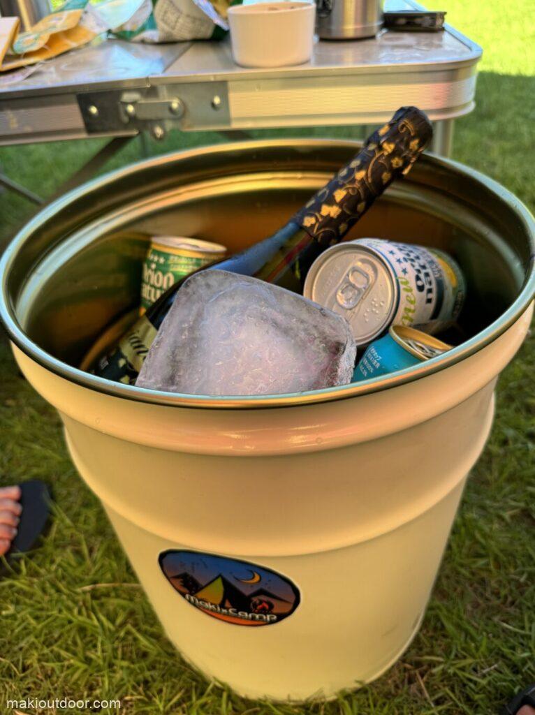 ペール缶に氷を入れて、飲み物を冷やす。