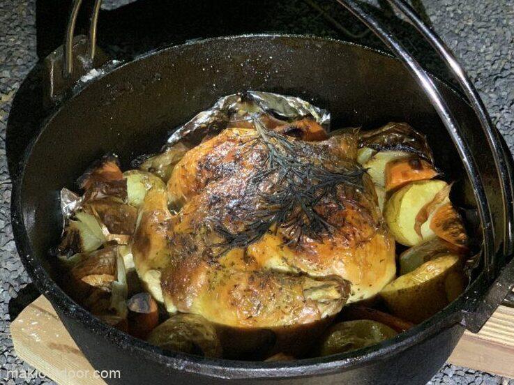 今回のキャンプ飯は、アルミホイルできのこの炊き込みごはんと、ダッチオーブンで丸鶏のローストチキン!